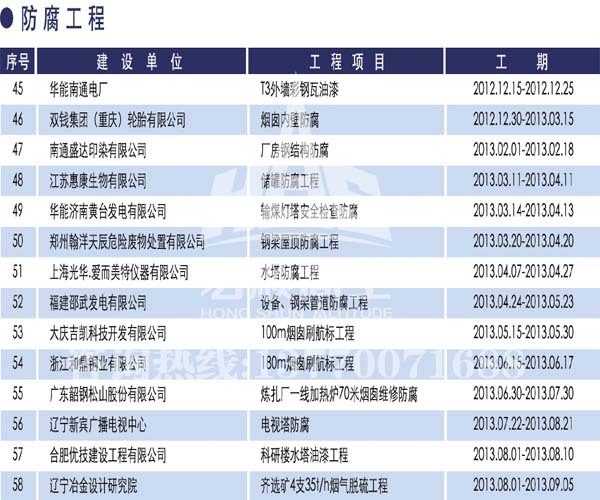 - 宏順建設(shè)核心技術(shù) 宏順建設(shè)專業(yè)防腐各種水塔防腐,儲(chǔ)油罐防腐,管道防腐,吊機(jī)防腐,龍門吊防腐,水泥筒倉(cāng)防腐工程,有多年的成功經(jīng)驗(yàn),施工業(yè)績(jī)遍布全國(guó)各地... 了解詳情